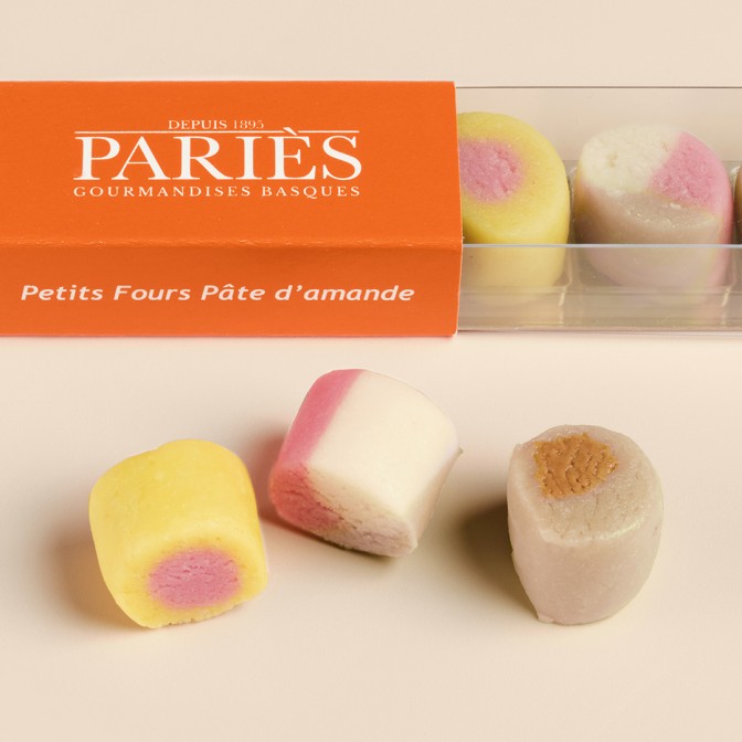 Ingrédients: sucre, amandes, sirop de glucose, noisettes, orange, citron, café, pâte de cacao, pistache, eau de vie de framboise, stabilisant : sorbitol, émulsifiant : lécithine de soja, colorants : extraits naturels de curcuma.